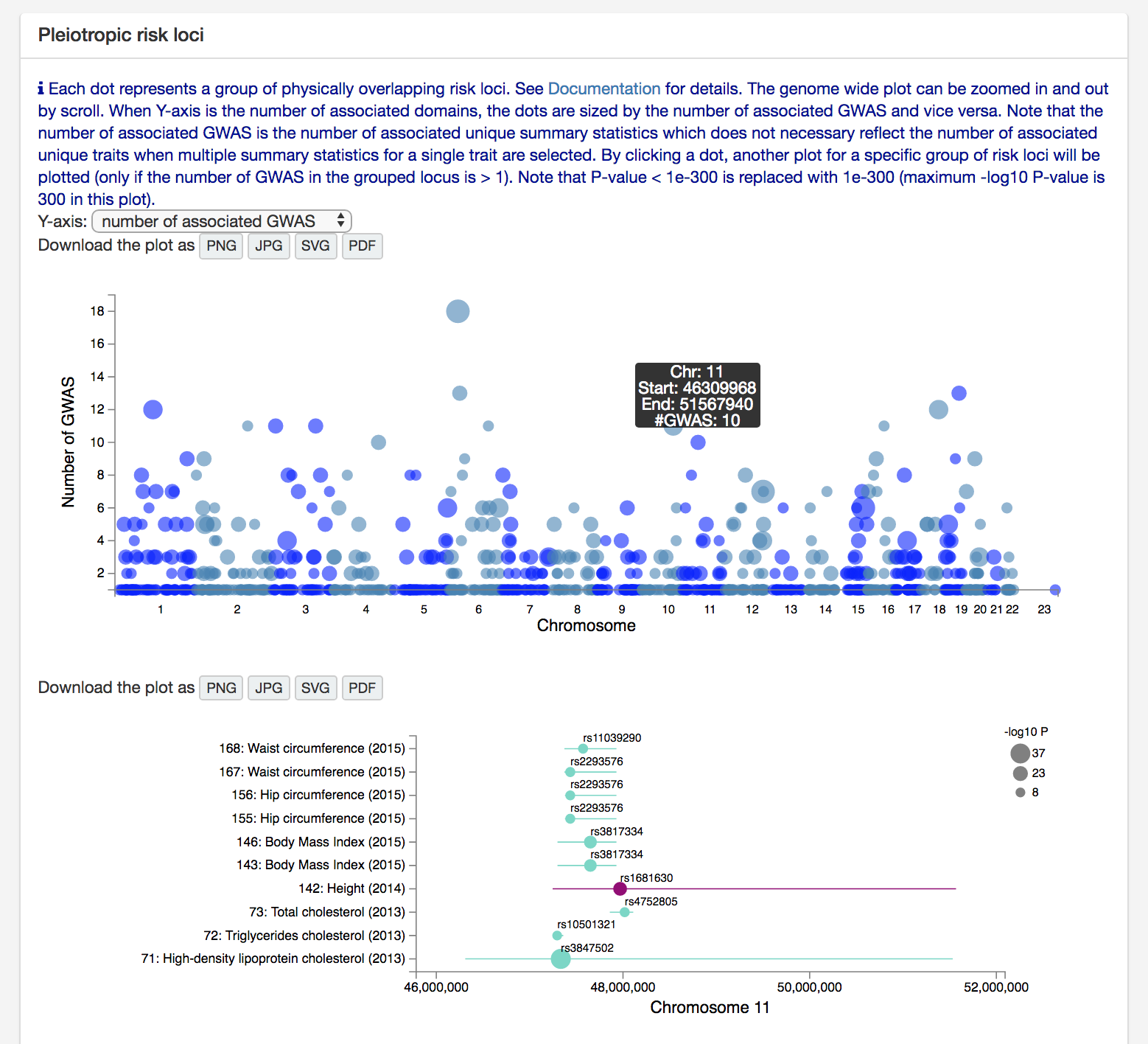 At the second last box on the "Multiple GWAS Comparison" page, there is a manhattan like plot for pleiotropic risk loci.