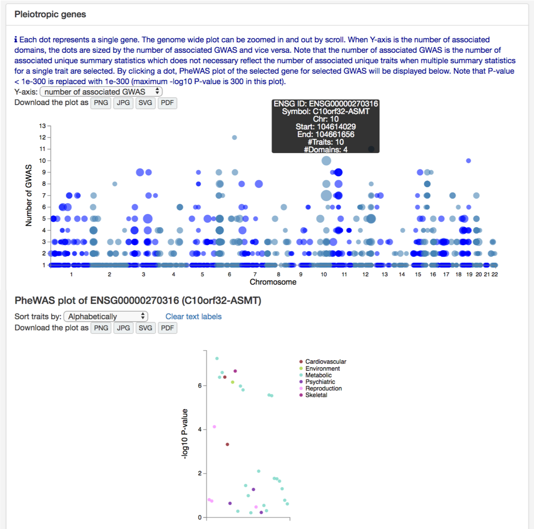 Second comparison is to compare the number of associated GWAS per gene. At the bottom of "Multiple GWAS Comparison" page, there is a manhattan like plot for pleiotropic genes. Y-axis is the number of associated domains by default which can be changed to the number or associated GWAS (the bottom plot uses number of associated GWAS for Y-axis). As a measure of pleiotropy, we recommend to use the number of associated domains when you have multiple traits from multiple domains since traits within a domain tend to have higher phenotypic correlation. When you are comparing traits within one or a few domains, or you don't suspect high phenotypic correlation between selected traits within a domain, the number of associated GWAS might be better measurement for pleiotropy. Note that the number of associated GWAS is the number of unique summary statistics. Therefore, this does not necessary represent the number of unique trait when multiple summary statistics for a single trait are selected.