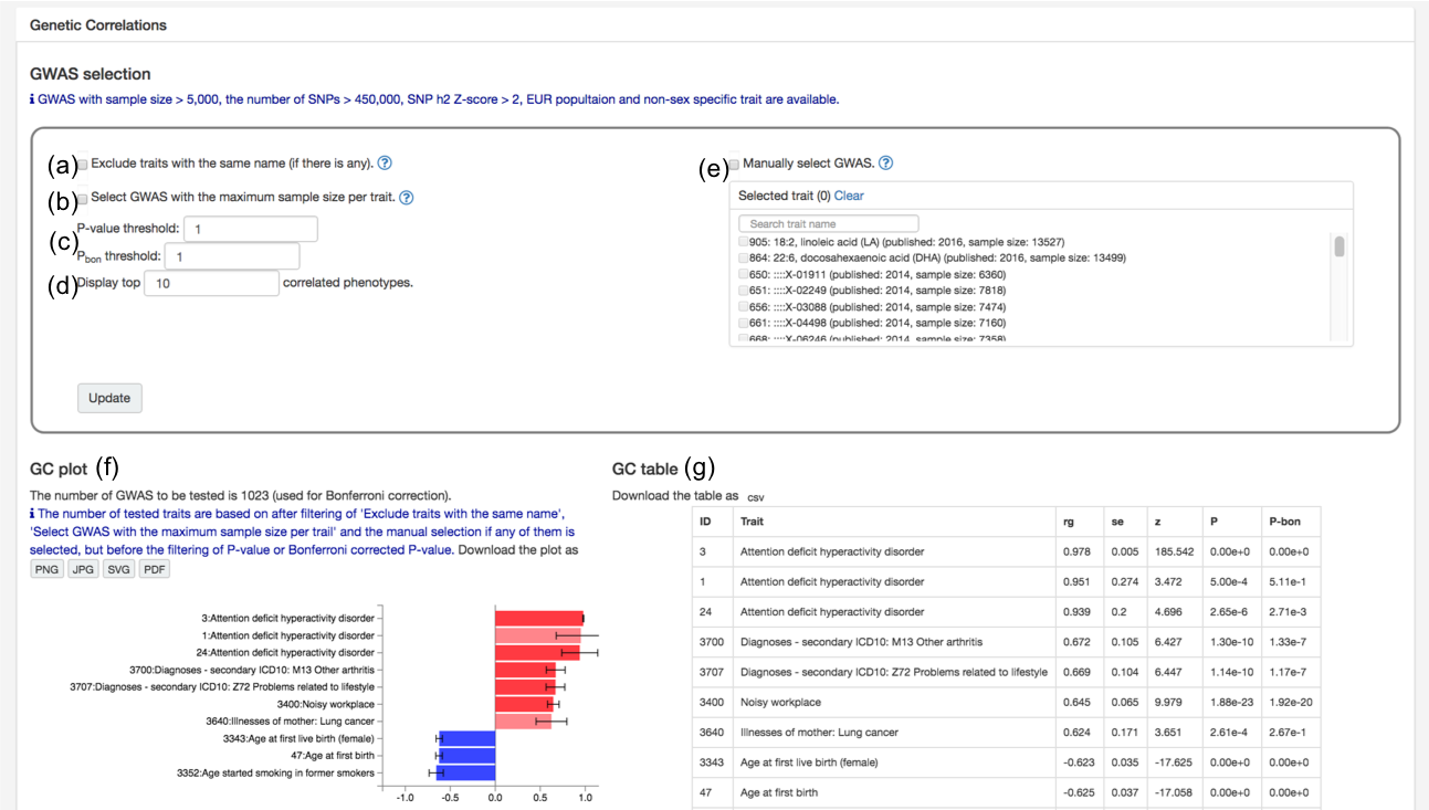 At the bottom of the trait page, you can find a plot and table of genetic correlation of the selected GWAS with the other GWAS in the database.