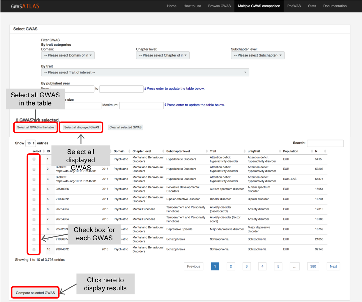 For example, when you filter GWAS on traits in Psychiatric domain, the "select all GWAS in the table" will check all psychiatric traits,
