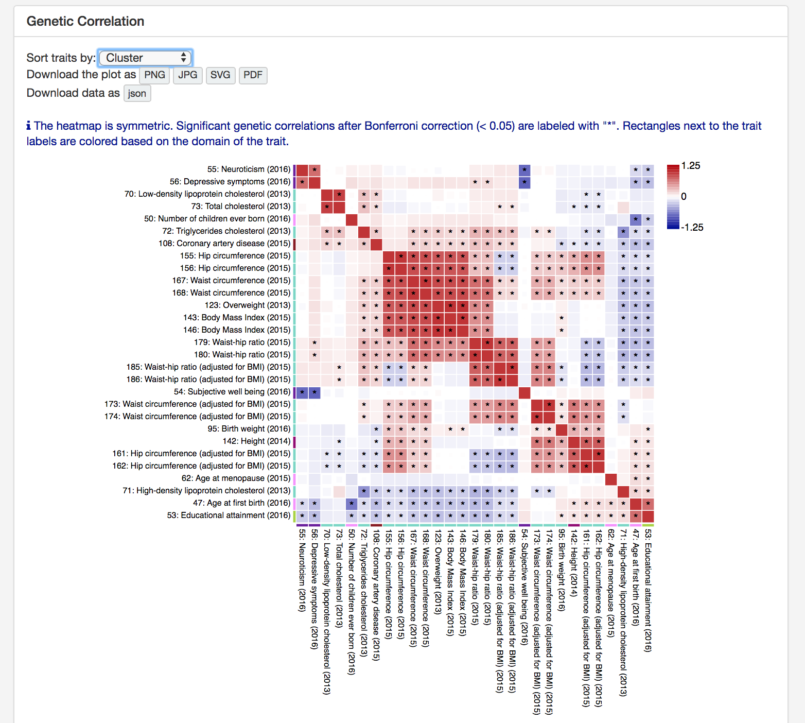 GWAS can be sorted by alphabetically, trait domain or hierarchical clustering.